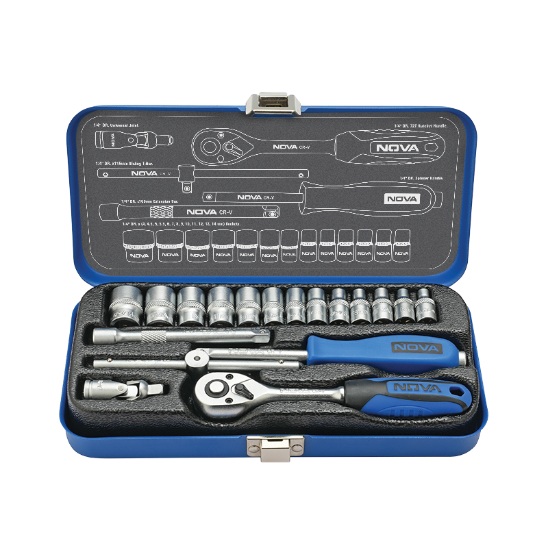 ست بکس ۱۸ پارچه نووا مدل ۶۴۳۰ با درایو ۱/۴ اینچ، یک مجموعه جمعوجور و بادوام برای مصارف صنعتی و کارگاهی است. تمامی قطعات این ست از فولاد کروم وانادیوم (Cr-V) باکیفیت ساخته شده و به روش Drop Forged تولید و سختکاری شدهاند تا برای استفادههای طولانیمدت، حداکثر استحکام را تضمین کنند. این مجموعه شامل یک دسته جغجغه ۷۲ دندانه ارگونومیک با روکش ضد لغزش است که کنترل و راحتی فوقالعادهای را در حین کار فراهم میکند.