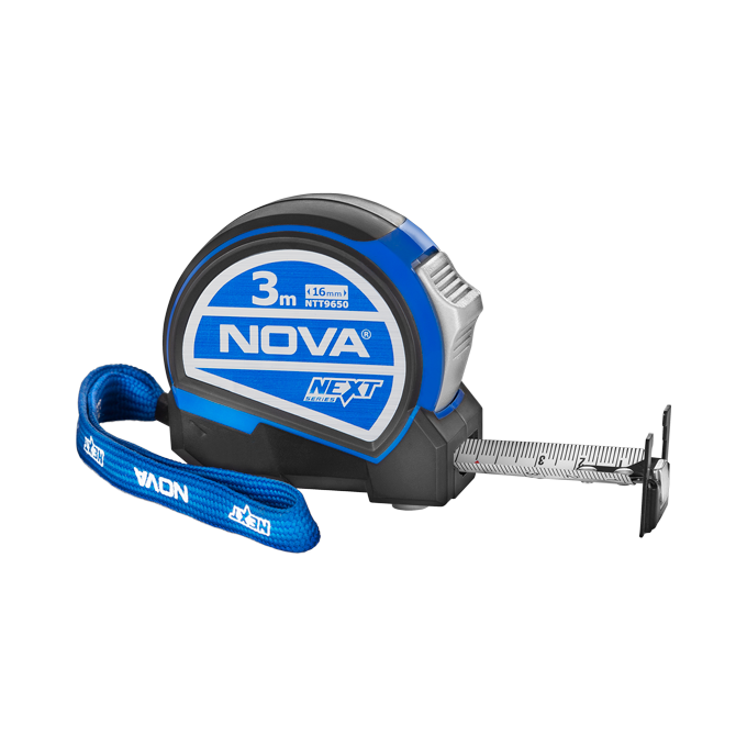 متر 3 متری سری NEXT نووا مدل 9650 با طراحی ارگونومیک و بدنه ساخته شده از پلاستیک ABS با کیفیت، انتخابی ایده‌آل برای مصارف خانگی، نیمه‌صنعتی و کارگاه‌های کوچک است. بدنه مقاوم و روکش لاستیکی ضد ضربه، این محصول را برای استفاده در شرایط کاری مختلف مناسب کرده است. تیغه سفید رنگ با روکش مات، چاپ اعداد درشت، و دو سیستم متریک افقی و عمودی با دقت Class II، دقت و سهولت اندازه‌گیری را تضمین می‌کنند.