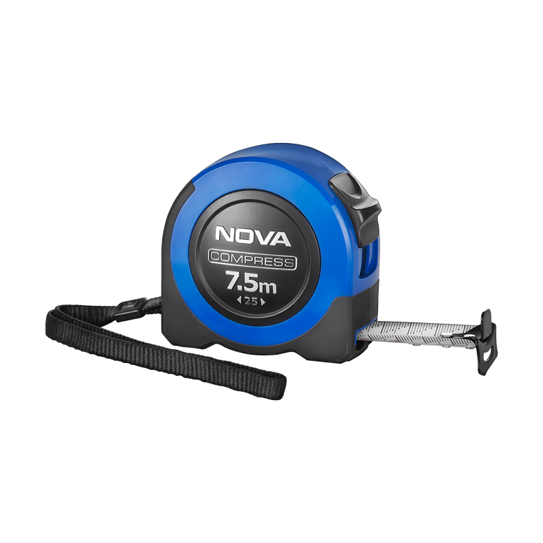 متر 7.5 متری سری Compress نووا مدل 3064 با طراحی ارگونومیک، جمعوجور و مقاوم، انتخابی مناسب برای استفاده در محیطهای خانگی و صنعتی است. بدنه این متر از ABS مقاوم با روکش لاستیکی TPR ساخته شده که در برابر ضربه مقاومت بالایی دارد و گرفتن آن را راحتتر میکند. تیغه فولادی سفید رنگ با روکش مات، چاپ دوطرفه و اعداد درشت طبق استاندارد JIS ژاپن، دوام بالا و خوانایی عالی را تضمین میکند. این متر مجهز به سیستم متریک با دقت Class II است که دقت اندازهگیری را افزایش میدهد.